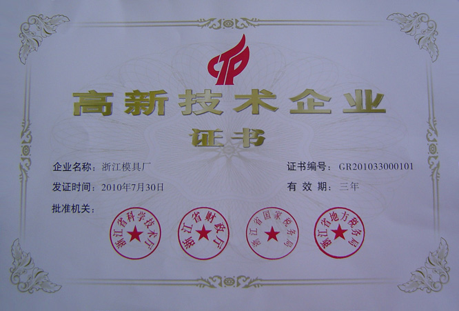 浙江模具厂被认定为“国家重点扶持的高新技术企业” ,文件号:浙科发高(2010)183号。工厂将以此为契机 加强科技投入,提高自主研发能力,为客户提供更精更快的产品。